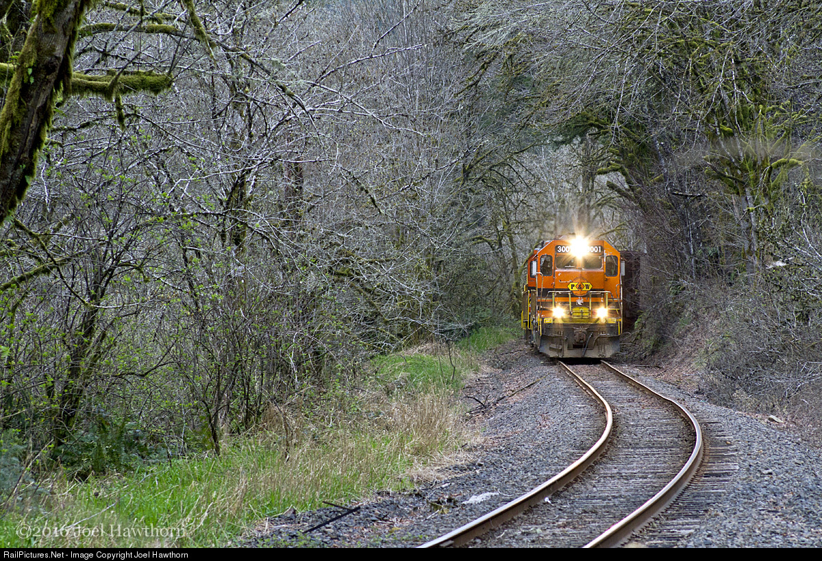 The 3001 is working its hauler through some thickly forested country, up and over the Coast Range Mountains of western Oregon. It is nearly twenty miles into a 7+ hour, 74.7 mile long trek bound for Albany, Oregon pulling a 14 car train loaded with wood products from the Georgia Pacific Mill at Toledo, Oregon. The consist also includes sister #3002, GP39-2 #2310 and the two slug helper engines #101 & #102.