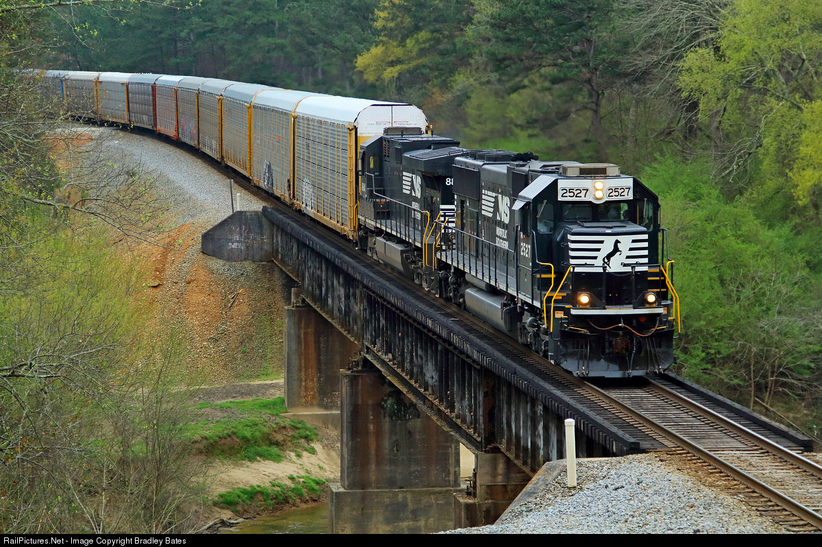 | Norfolk Southern Vehicle Train 27A roars over the Tallapoosa River just West of Downtown Tallapoosa, GA. With NS SD70 #2527 leading a NS C40-9 |