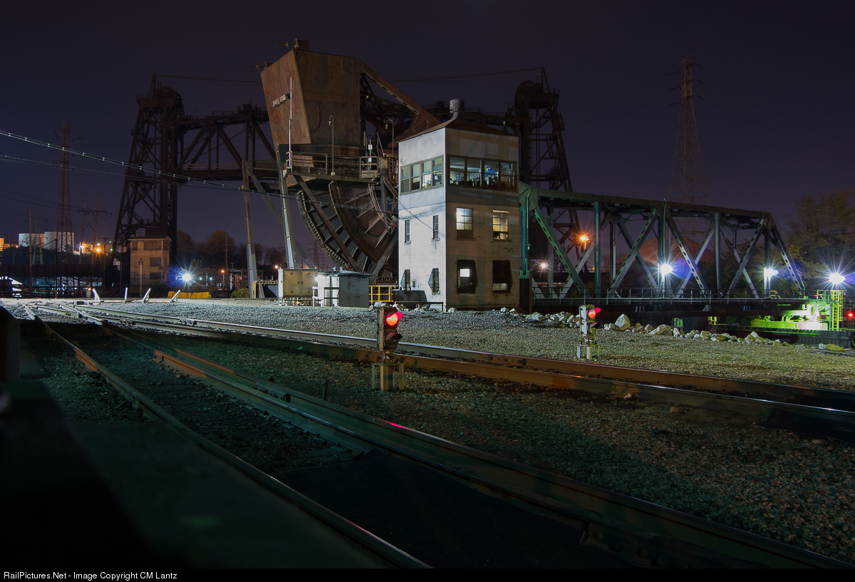 Nightime at the ArcelorMittal Steel, Cleveland Works, Clark Avenue Tower at the Cuyahoga River drawbridge.