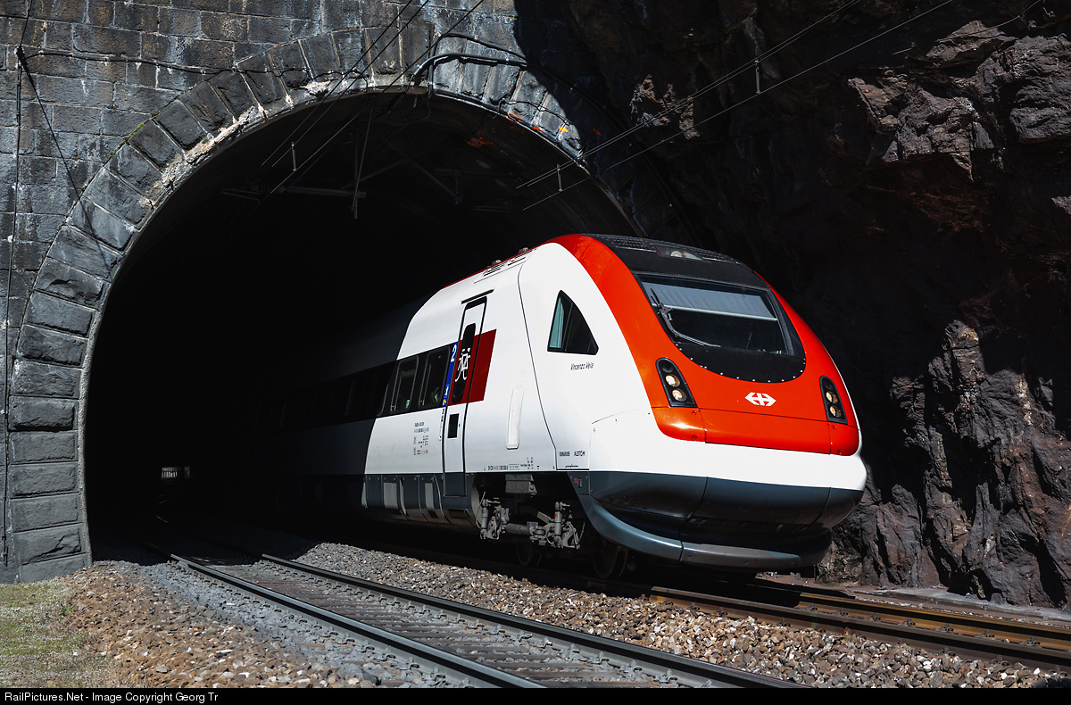 | Tilting train ICN RABDe 500 # 008 "Vicenzo Vela" is leaving the 304 meter long Polmengo tunnel near Faido, on the way from Zürich to Lugano as ICN 865. |