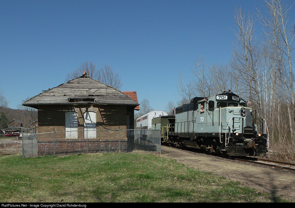 A Hocking Valley Scenic Railway Easter Bunny Train Trip passes the old depot in Haydenville with former SP Construction Services GP10 701 on the point under a beautiful clear Easter Weekend Saturday sky.
