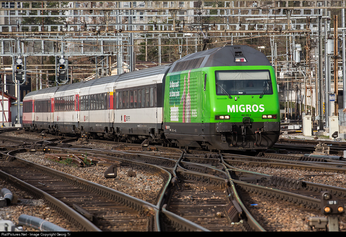 | Re 460 # 080 in the "Migros" (a large swiss retailer) paint scheme is entering Winterthur with the Inter Regio 2130 from Konstanz to Zürich. |