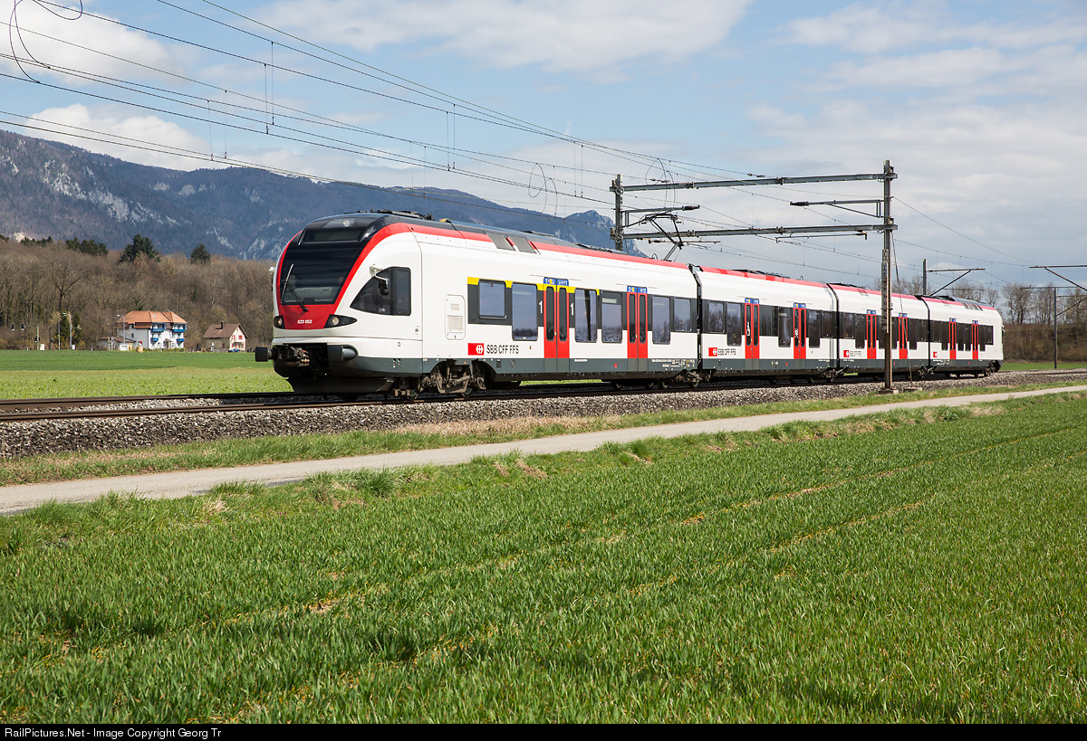 | "Flirt" trainset RABe 523 # 052 running as R 7622 between Solothurn and Biel/Bienne, along the Jura mountain range. |