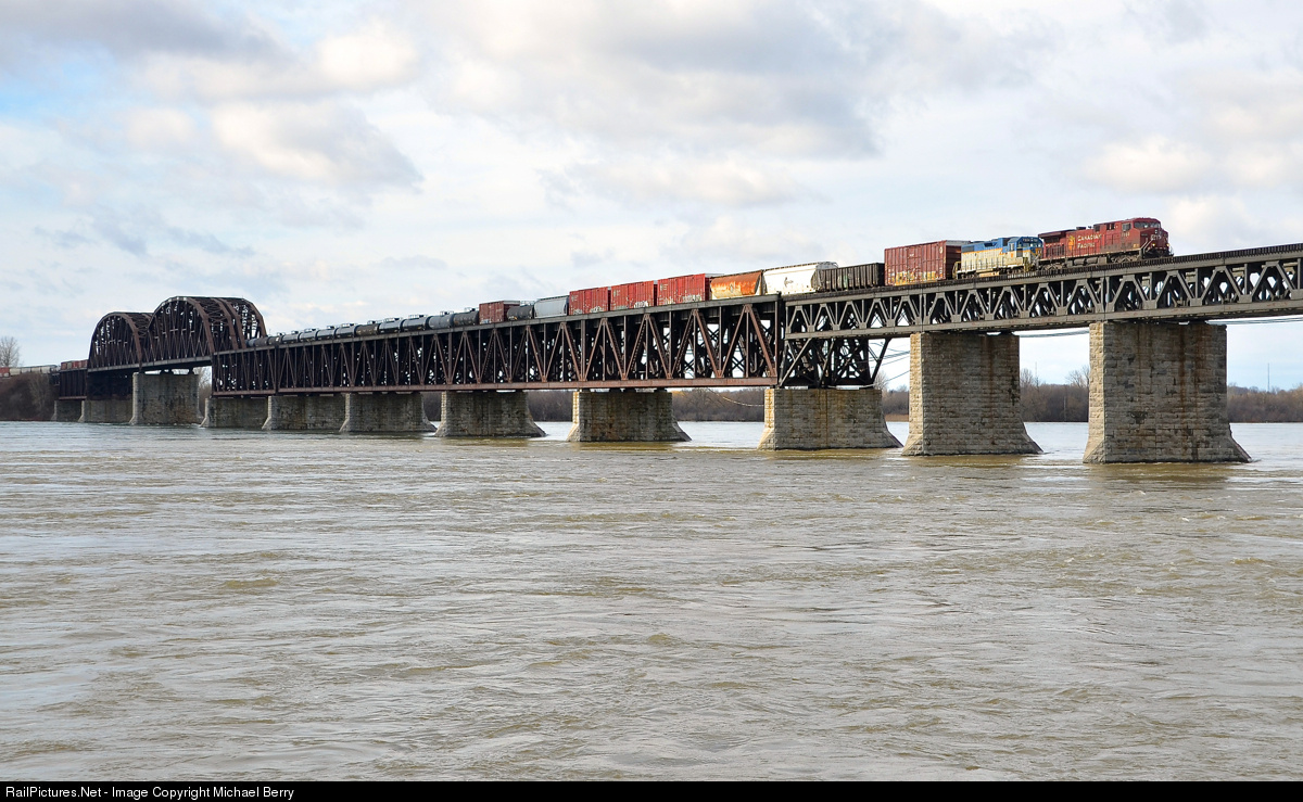 Bringing in a D&H unit for servicing. DH 7304, One of two remaining units on the CP system still sporting the D&H lightning stripe paint scheme, is trailing on CP 253, with CP 8603 leading as the train crosses the St-Lawrence River. DH 7304 is en route to St-Luc Yard for routine servicing.
