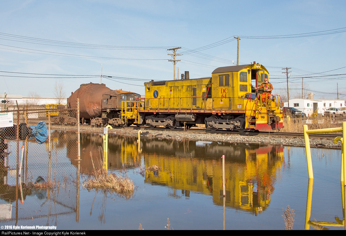 One of the coolest operations I have seen in Southern Detroit has to be the Delray Connecting Railroad. Operating over about 2 miles on the north end of the CN Flat Rock Sub. Loads come out of the smelter on Zug Island, cross the river and proceed about 2 miles to the mill where it is formed. Passing by some standing water as a result of recent heavy rains, DC 64, a SW1001 rumbles to the mill with a single bottle car as the infamous "Ditchlight Dan" comes out to inform me of another train heading back to the smelter, and then proceed to announce to the world that there were people out taking pictures, including plant security. Oh well, we escaped the authorities for another day.