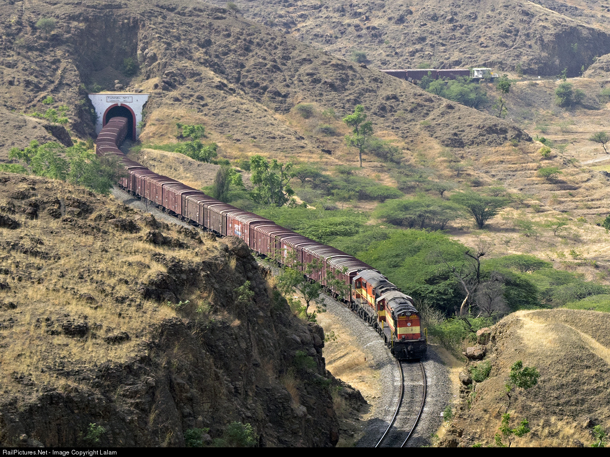 A long BCNA goods train hauled by WDG-3A pair climbs up the Shindavane ghat through tunnel No. 1.