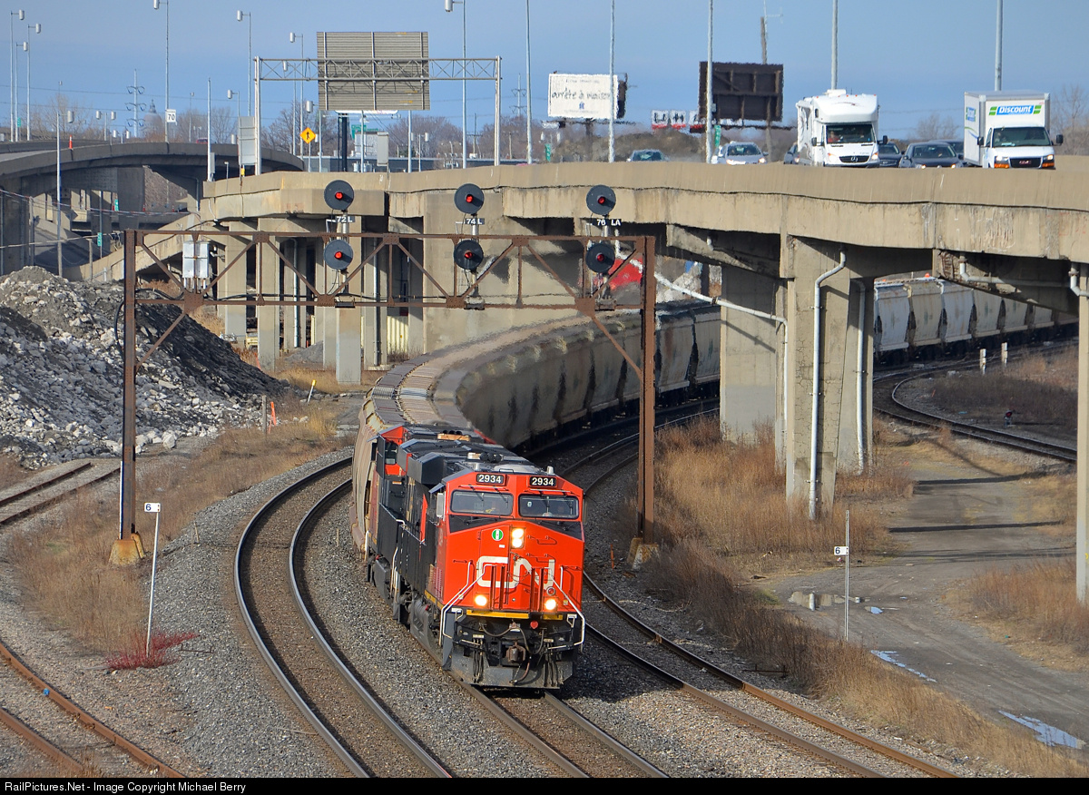 | By MP 6, CN Montreal sub. CN B730 with 152 loads of Potash destined for Saint John, NB is slowly starting to leave Turcot West in Montreal after changing crews as it passes milepost 6 of CN's Montreal sub. Power is a trio of ES44AC's, with CN 2934 & CN 2812 at the head end and CN 2940 bringing up the rear. |