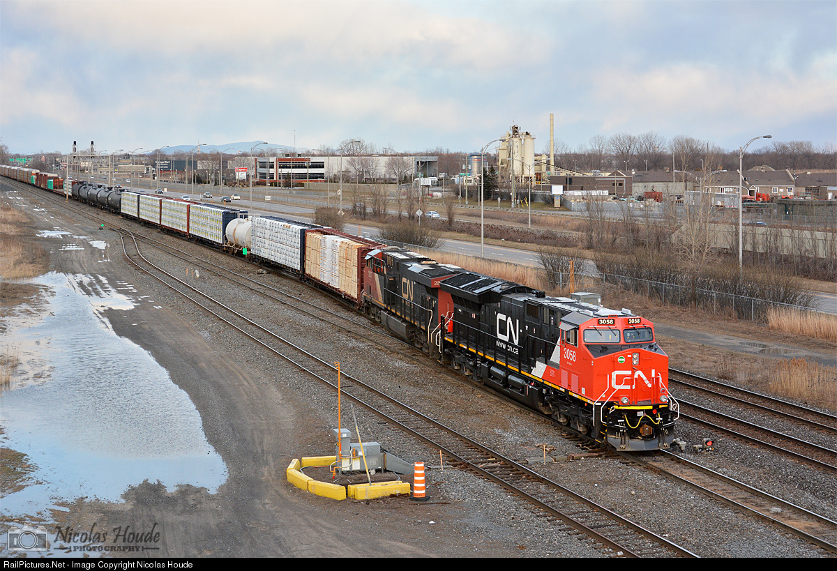 | CN M30921 03 pulls 38 cars in the north service track in the CN Southwark yard. A brand new GE ET44AC, CN 3058, leads the 3267 feet train lenght with a GE ES44AC CN 2807 as second unit. |