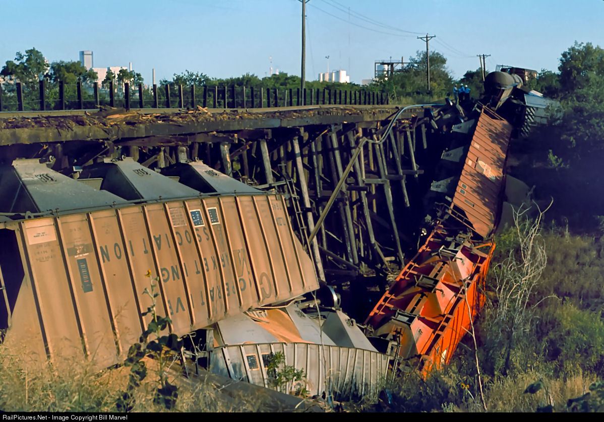 Saint LouIs-San Francisco Train 139 has come down from Oklahoma on June 24, 1978, 68 cars, mostly grain hoppers, tank cars for the Gulf, seven empties and a caboose, all behind GP38-2 685. Rattling along at eight miles an hour on Cotton Belt rails, the slack has unexpectedly run in, dumping a half dozen or so cars (but fortunately not the tank car, background) off the Trinity River Bridge in North Fort Worth. Resulting damage to bridge and cars will take several days to clean up, and according to the U.S. Department of Transportation Accident/Incident Report will cost the railroad and its insurers an estimated $96,000 in pre-inflation 1978 dollars (three times that today).