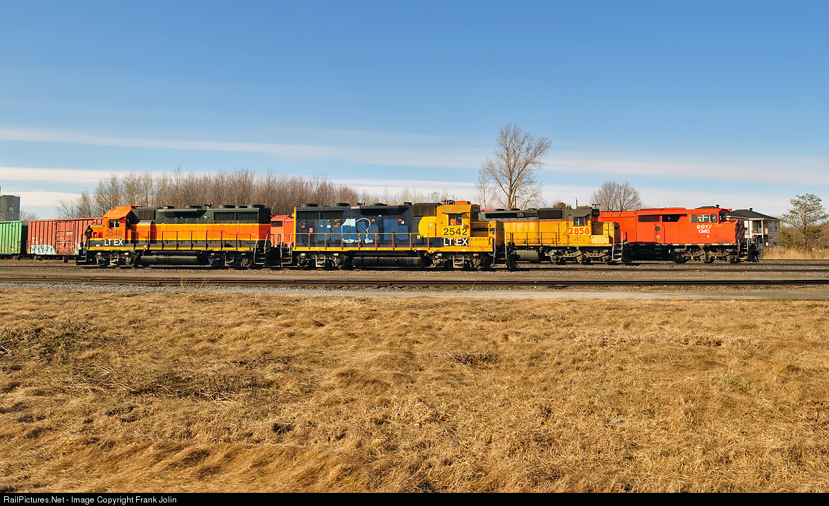 | A group of locomotives in service with the Central Maine & Quebec Ry pose at Farnham Yard. LTEX GP35u's 2542 2540, PRLX SD40T-2 2858, CMQ SD40-2F 9017. |
