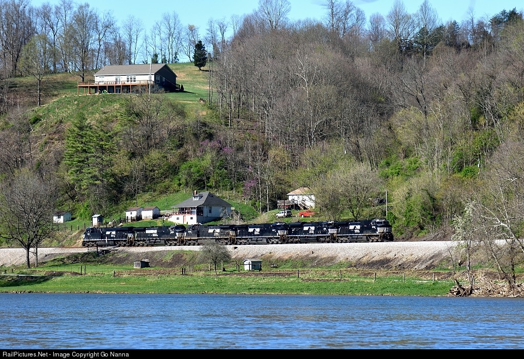 Light move of six engines south of Eggleston along the New River. Surrounding greenery and the line up of black horses in the NS logo enrich a taste of spring for this Sunday morning shot.