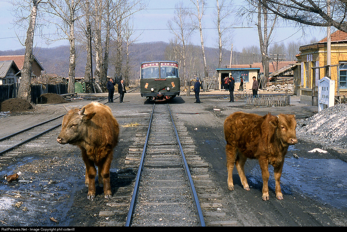 The arrival of a narrow gauge railcar at Xiangyang fails to impress the local wildlife. This was on the Shanhetun logging railway, which closed soon after this.