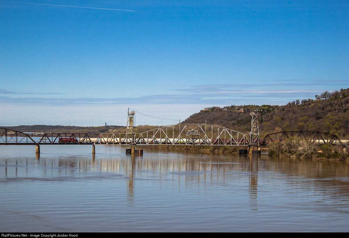 A lone C420 running long hood forward lugs a cut of cars across the vertical-lift through truss bridge spanning the Arkansas River on its way to the Fort Smith interchange yard.