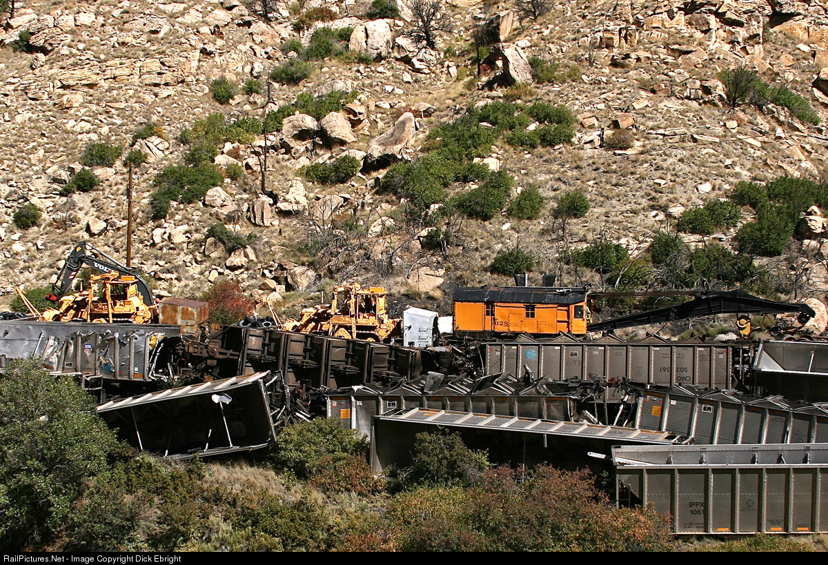 | What a mess. An eastbound Utah Ry. empty coal train derailed in Utah's Price River Canyon while passing a westbound Union Pacific loaded coal train and loaded cars from the westbound derailed into the Utah Ry. train. Seven loaded cars on the Union Pacific train CSVPH-24 derailed due a broken rail and were struck by passing cars on the Utah Ry. train. A total of 7 loaded cars in the UP train derailed and 16 empties from the UTAH train derailed. Access was difficult as the tracks were separated from the highway by the river. The ex. D&RGW wreck train was called to the location from Grand Junction. Seen here is the Grande's 250 ton Bucyrus Erie crane MW028, the Rio Grande's largest, which was on location but was apparently not used. The wreckage was shoved over the bank by several cats and trackhoes to provide enough clearance for one track to be opened to restore traffic. The first train through was an eastbound BNSF powered empty coal train. The crane was named "Samson de Grande" in a D&RGW employee contest. See FRA report HQ-2007-52 for all the details. |