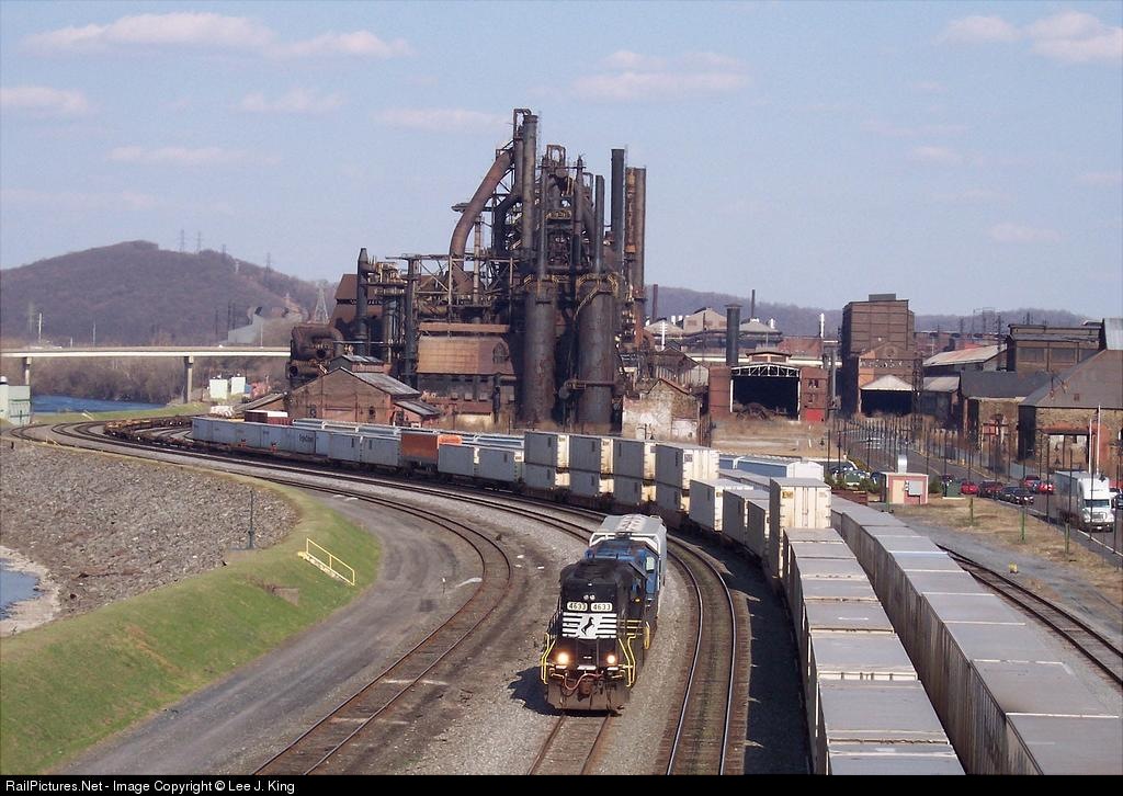 | Down-on of NS local running long-hood forward with OLS geep returning to Allentown Yard after picking up 1 car up the Lehigh Line, here passing the great Bethlehem Steel complex. |