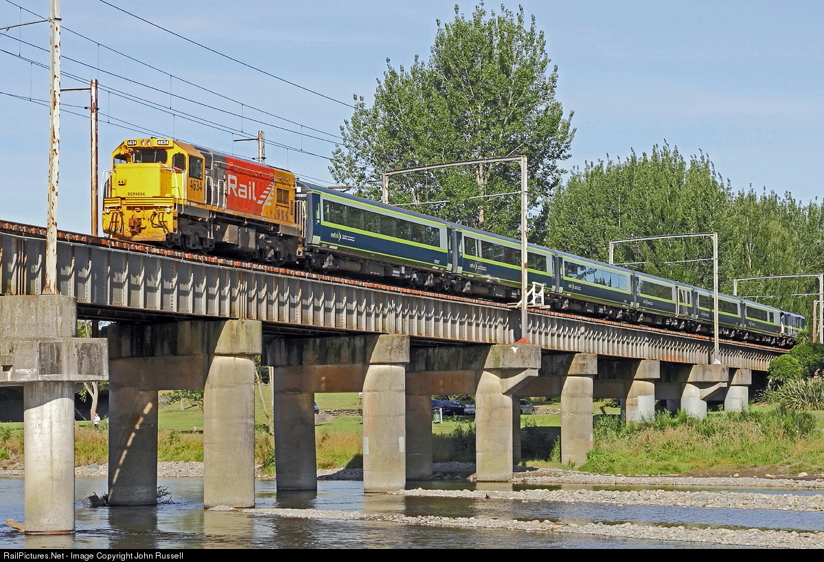 | Metlink train 1615 from Masterton to Wellington crosses Hutt River at Silverstream. DFT locomotives have now replaced DC locomotives. These commuter trains pass through Rimutaka tunnel which is 8.5Km (5.5 miles) long which requires special fire suppression equipment fitted to locomotives on passenger trains. |
