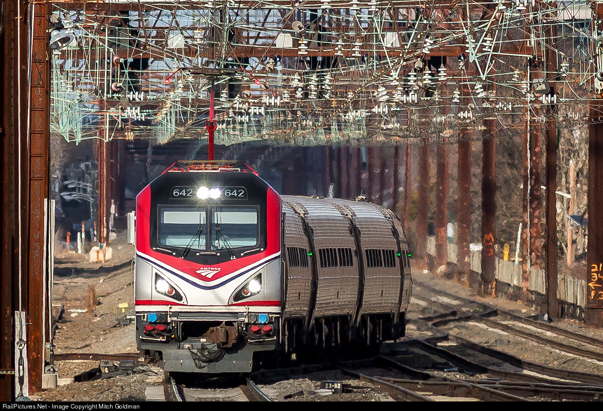 Amtrak's Veteran's ACS-64 slowly snakes its way down the NEC Corridor crossing over the express track and onto track 4 just ahead of NJT's Jersey Avenue stop.