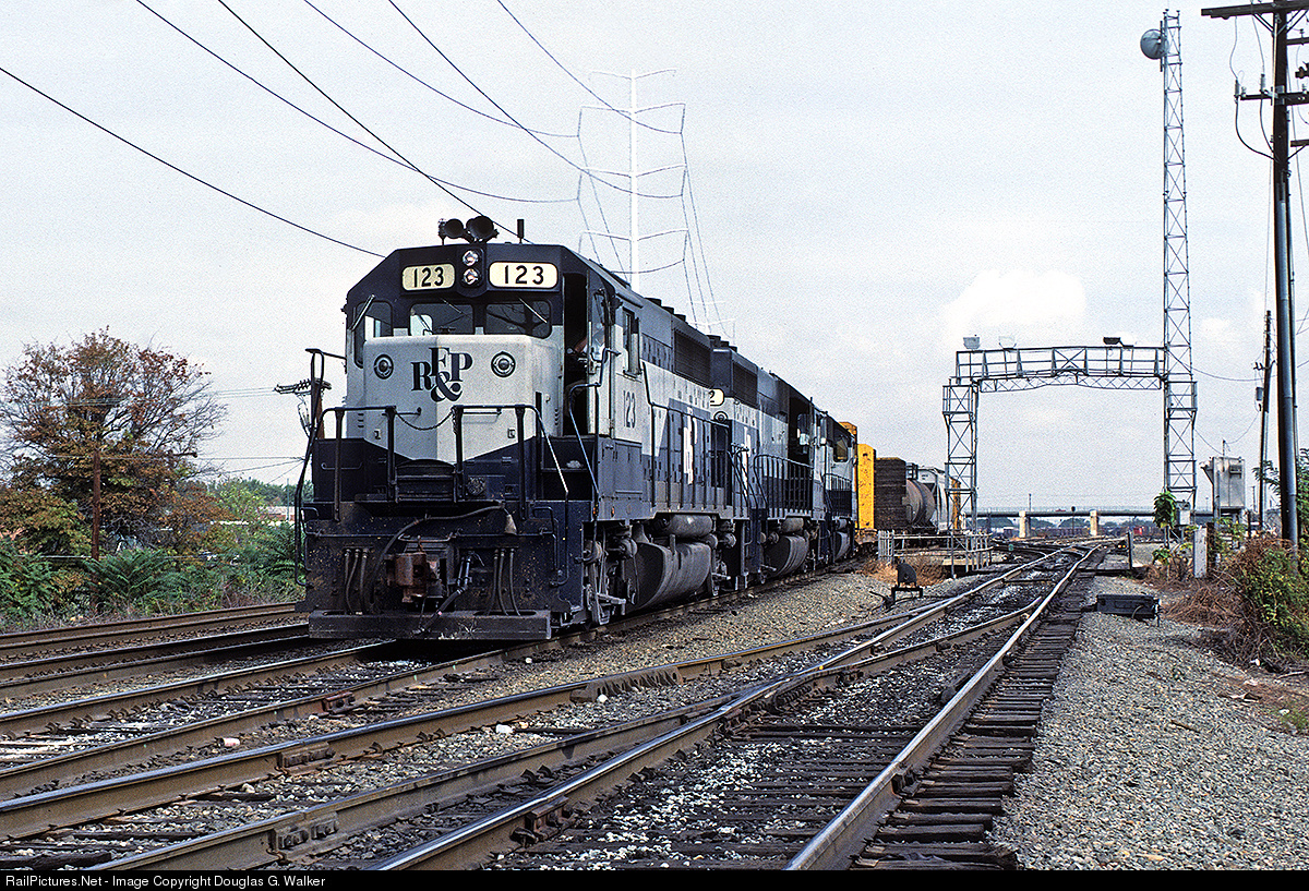 Richmond Fredericksburg & Potomac GP40 123 leads a train at the railroad's yard in Alexandria, Virginia, on September 12th, 1986.