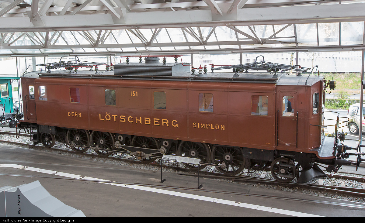 Electric locomotive Be 5/7 # 151 (in fact it is # 161, but has the numberplates of 151) of the Bern-Lötschberg-Simplon Bahn, built in 1913 by SLM, BBC and MFO for the new Lötschberg mountain line, electrified from start. Weight 107 metric ton, power 1840 kW, max. velocity 75 km/h, retired in 1964, exhibited in the Swiss Museum of Transport in Lucerne.