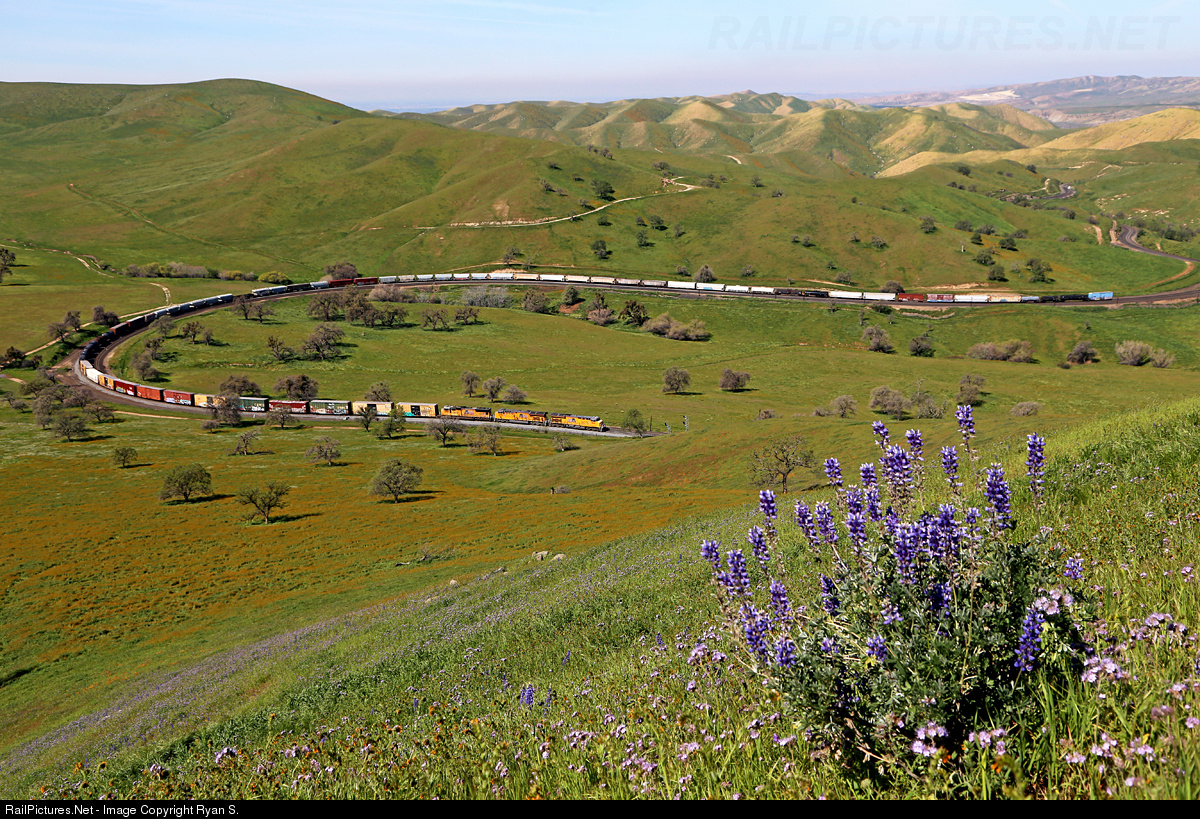 | Trading distance for elevation Southern Pacific's Civil Engineer William Hood was able to take his railroad out of the Caliente Valley and over the once thought insurmountable Tehachapis. In just 6 rails miles Hood's road climbed 700' in elevation leaving the floor of the Caliente Valley, the same distance as the crow flies was separated by 1 mile. Following the grade carved into Tehachapi's rolling hills in 1876, eastbound Union Pacific tonnage conforms to the Allard Horseshoe curve as it climbs through the Tehachapis. |