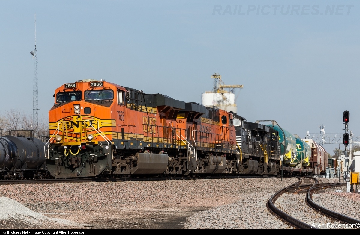 | BNSF 7668, BNSF 5927, NS 9417, & NS 7567 lead the KickPass through Aurora NE on BNSF's Ravenna subdivision. |