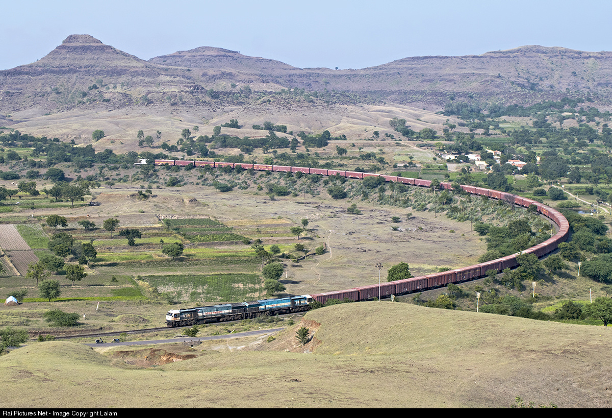 Combined power of 8000HP by a pair of EMD GT46MAC a.k.a. WDG-4, hauling a fully loaded freight with 43 wagons through Daundaj. At this point of the curve, the Guard of the consist, comes out of the caboose to exchange 'all clear' green flag signal with the Loco-pilot.