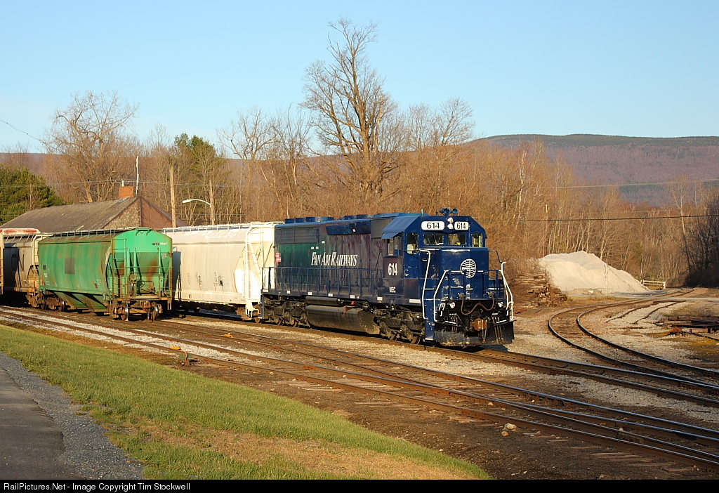 Fresh Paint: Having finished interchanging with Vermont Railway, recently repainted MEC SD40-2 #614 leads ST Train XO-1 out of North Bennington Yard as it begins its return trip to Mechanicville, NY and, ultimately, Rotterdam Junction. The track to the right is the former Bennington Branch. Although only a short section of this line is still used for interchange and car storage, the tracks are still in place all the way to downtown Bennington. In the days of the Rutland Railroad, the tracks continued beyond Bennington over the "Corkscrew Division" to Chatham, NY and a connection with the New York Central.