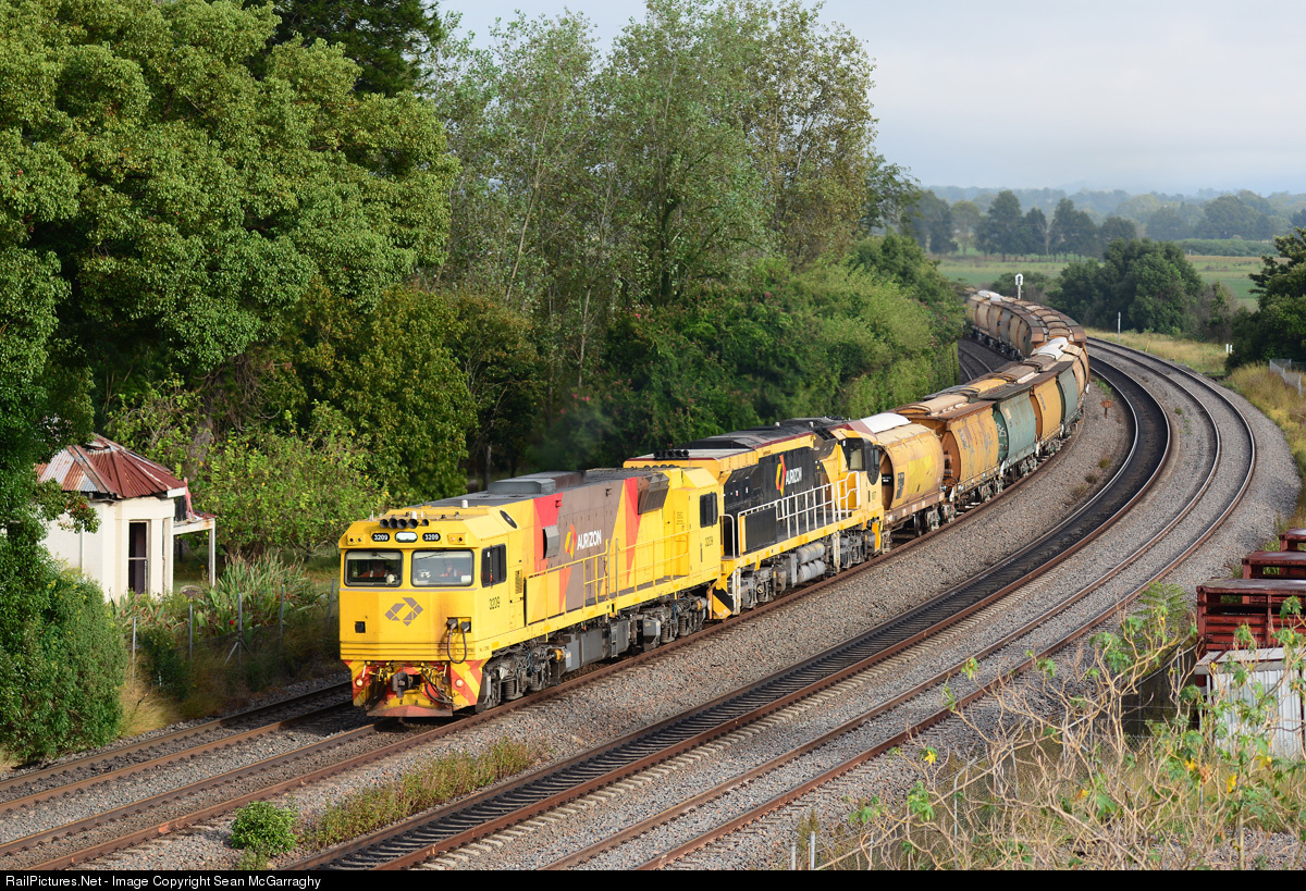 | The recently commenced Aurizon hauled grain service that operates out of Carrington, Newcastle is seen at East Maitland behind locomotives 3209 & 6007 having loaded the previous day at Moree. |