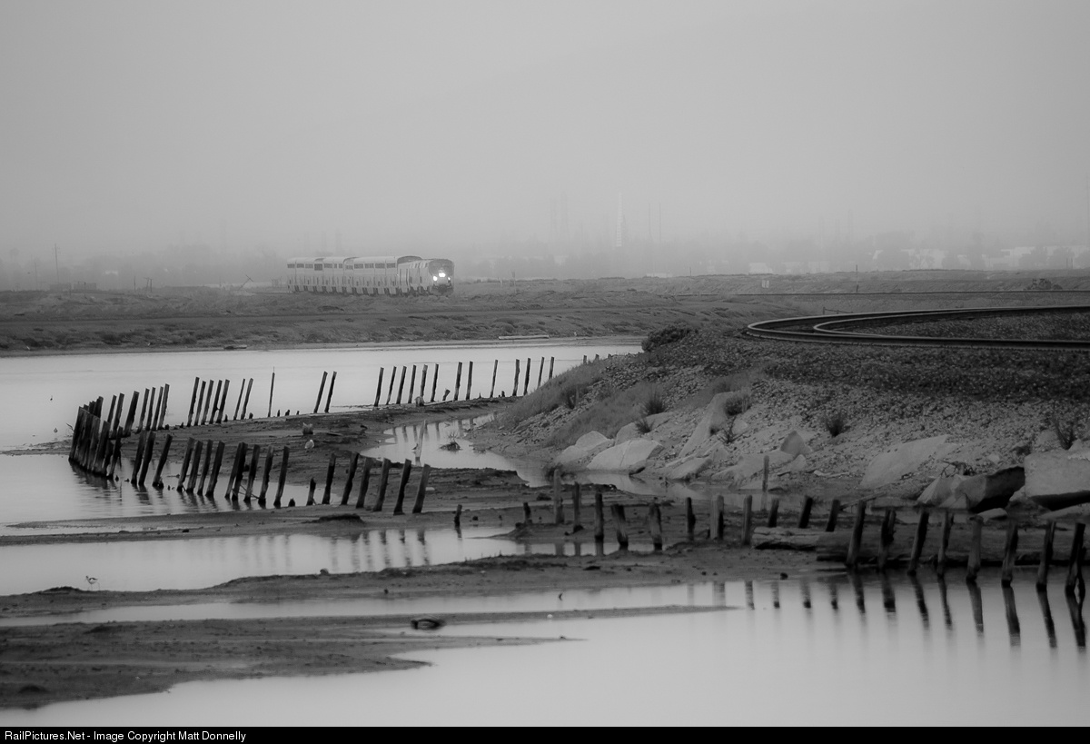 The Coast Starlight makes its way across the Alviso slough lands on a misty and moody morning. The weather ended up making for a rather unusual take on this scenic setting.