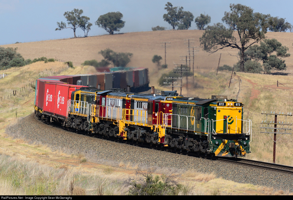 | A rare sight in today's era sees quad Alco's 872, 4836, 852 & 864 combine to haul QUBE Logistics' Harefield to Junee containerised paper shuttle for Visy. The train is rounding the 'S' curve about halfway into it's short 12km journey. Locomotives 4836 & 852 are leased from Junee Railway Workshops. |