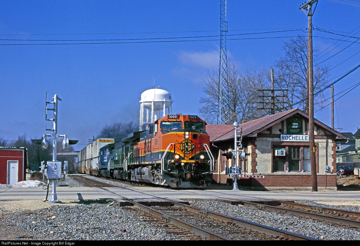| BNSF 1069 rolls an eastbound intermodal train past the Rochelle, IL BN depot 27 years to the day after the BN merger. By this time BNSF is in its second year, and 1997 was the year of Heritage I. By 1998 Heritage II would arrive and by 2016 Heritage I GEs would be stored. |
