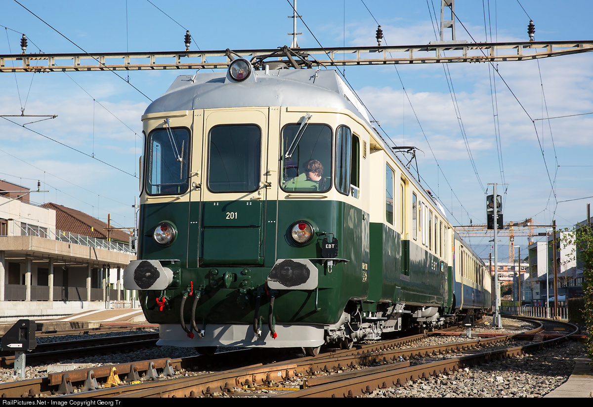 Highpower railcar BDe 4/4 II # 201 "Burgdorf" of association "Verein Pendelzug Mirage" (VPM) in Lyss. The 2060 kW railcar is in fact the former BDe 4/4 # 82 "Rapperswil" of the Südostbahn (SOB), built in 1966, later renumbered 576 482, then 576 054. Today it has the official number 94 85 7 576 054-1. New painted by the Bönigen works of the BLS since a few weeks and looking like new. The original BDe 4/4 II # 201 of the EBT (Emmental-Burgdorf-Thun Bahn), built in 1966 by SIG and BBC, was scrapped in 2007. So the association VPM bought this identical vehicle (# 82) from the Südostbahn and disguised it as "EBT" # 201.