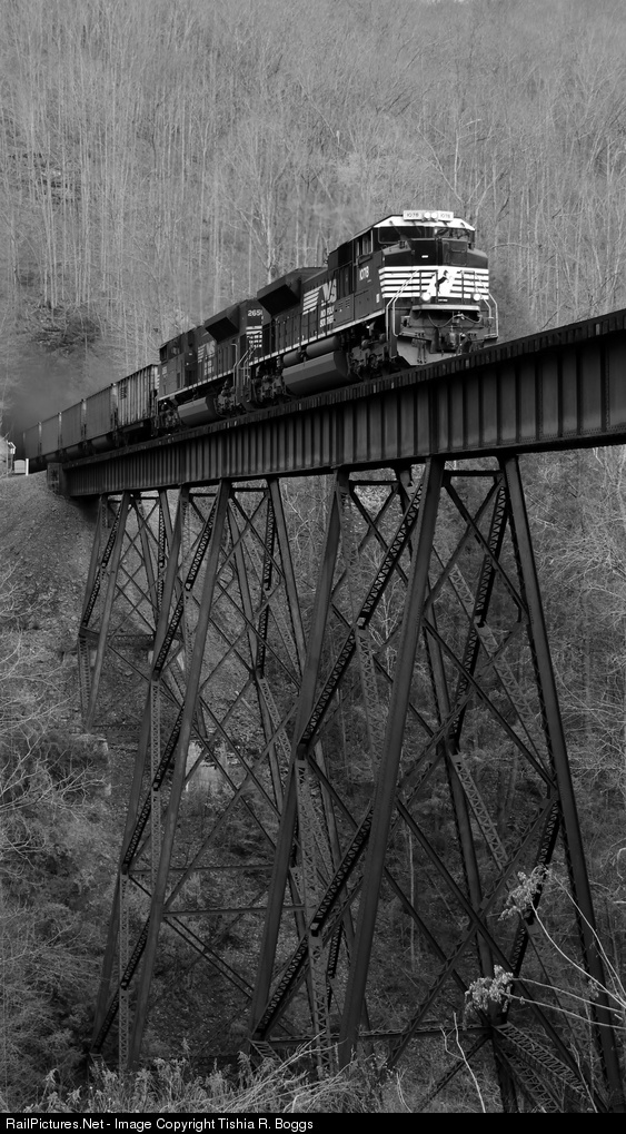 At 520 feet long and 126 feet high, Hamilton Trestle (Bridge No. 56) is the first of four high trestles moving west between St. Paul and Coeburn, VA along the former Norfolk & Western Lower Clinch Valley District of the Pocahontas Division. When the line was under construction, the high trestles began as wood...an engineering materpiece in the isolated Holbrook Hollow. The newer steel Hamilton Trestle extends 11 feet into the west portal of Holbrook Tunnel, a slate and sandstone tunnel measuring 196 feet long. Hamilton/Holbrook is the only high trestle in this section of Norfolk Southern line that is not visible from Highway Alt 58.