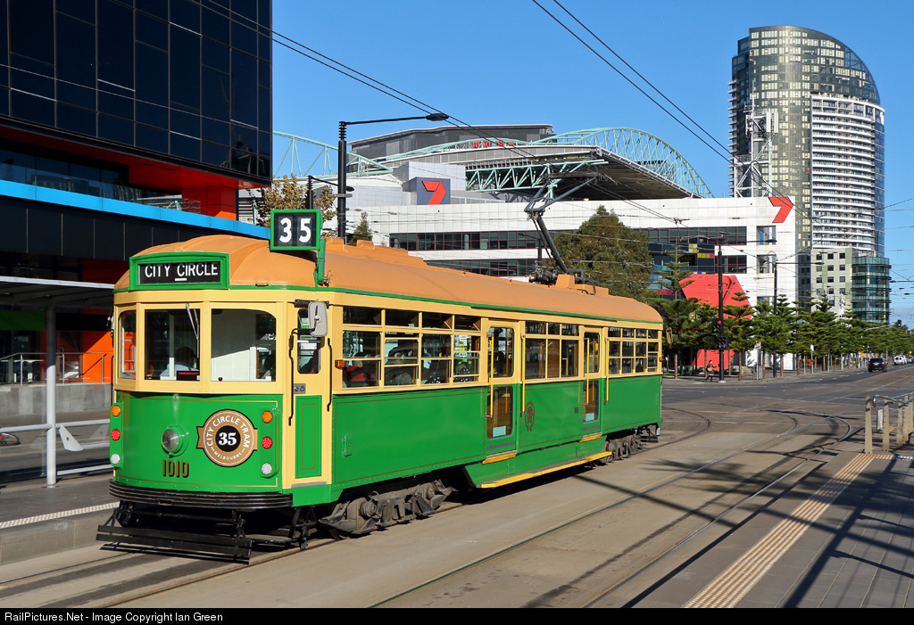 | Recently converted from a W7 to a W8 class by the Bendigo Tramways, 1010 runs a city circle service south along Harbour Esplanade. |
