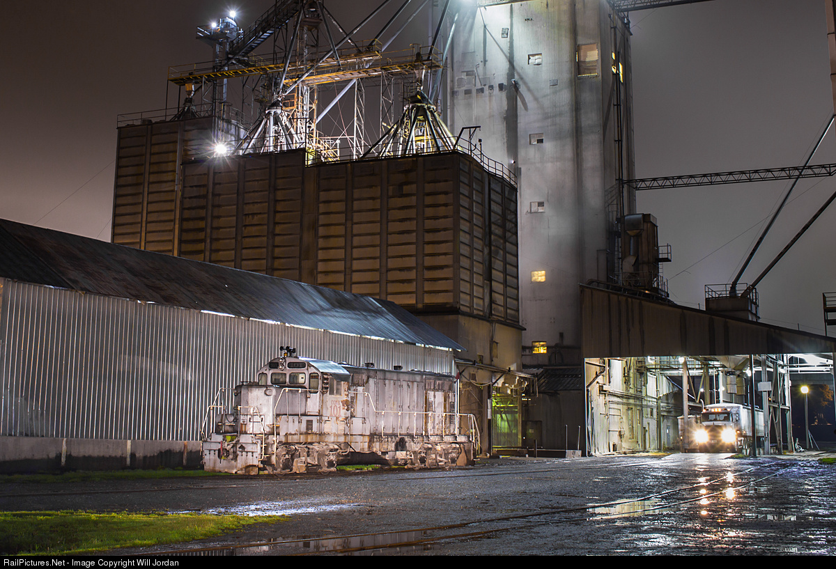 The Con Agra Feed Mill in Gainesville, Ga glows on a nasty, wet night as the night's rain begins to seize and the ever-thick cloud cover slowly breaks apart. All is quiet in this neck of the woods, at this point, (with the exception of the scream of grain being loaded into the truck to the right and the constant roar of the mill...) as the GP7 pictured here completed it's switching tasks earlier in the night, and the town of Gainesville sleeps silently in the midst of the April darkness.