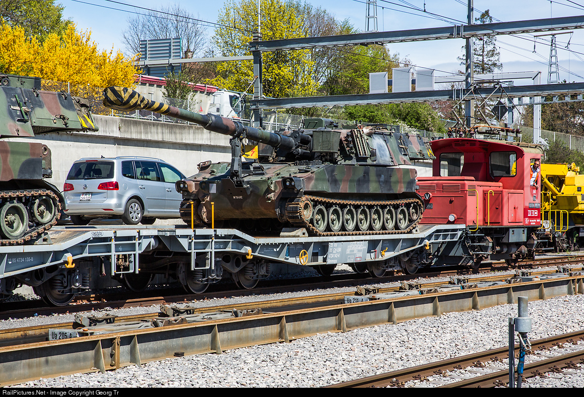 Electric shunter Te III # 147 of the MBC with a Slmmnps-y car, loaded with a M109 self-propelled howitzer of the Swiss Army. This car will be transported to the military training area near Bière over the 1 meter gauge track of the MBC on transporter trucks. The installation for this purpose is visible in the foreground. The 245 kW Te III # 147 is former SBB, was built in 1965 by SLM and MFO and came to the MBC in 2006.