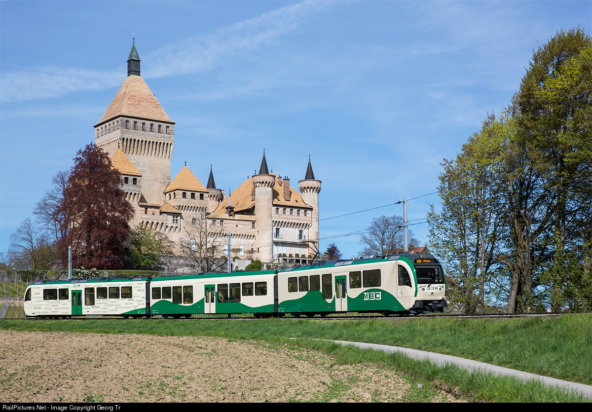 | New regional train of the MBC from Stadler Rail, with railcars Be 4/4 # 36 and # 35 and car B # 2068, as train 143 from Bière to Morges. The impressive Vufflens castle dates from the 15th century and is privately owned. |
