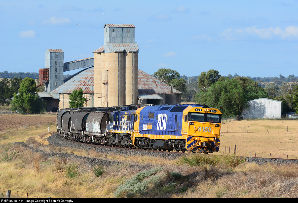 | The loaded grain from Coonamble rolls past the grain storage facility at Talbragar, near Dubbo, bound for Manildra behind locos 8150 & 48153. |