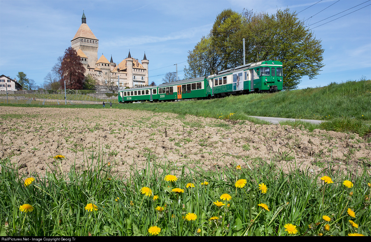 | Push pull train of the MBC with railcar Be 4/4 # 14, lowfloor intermediate car B and cab car Bt # 52, running as train 142 from Morges to Bière, in front of Vufflens castle from the 15th century. |