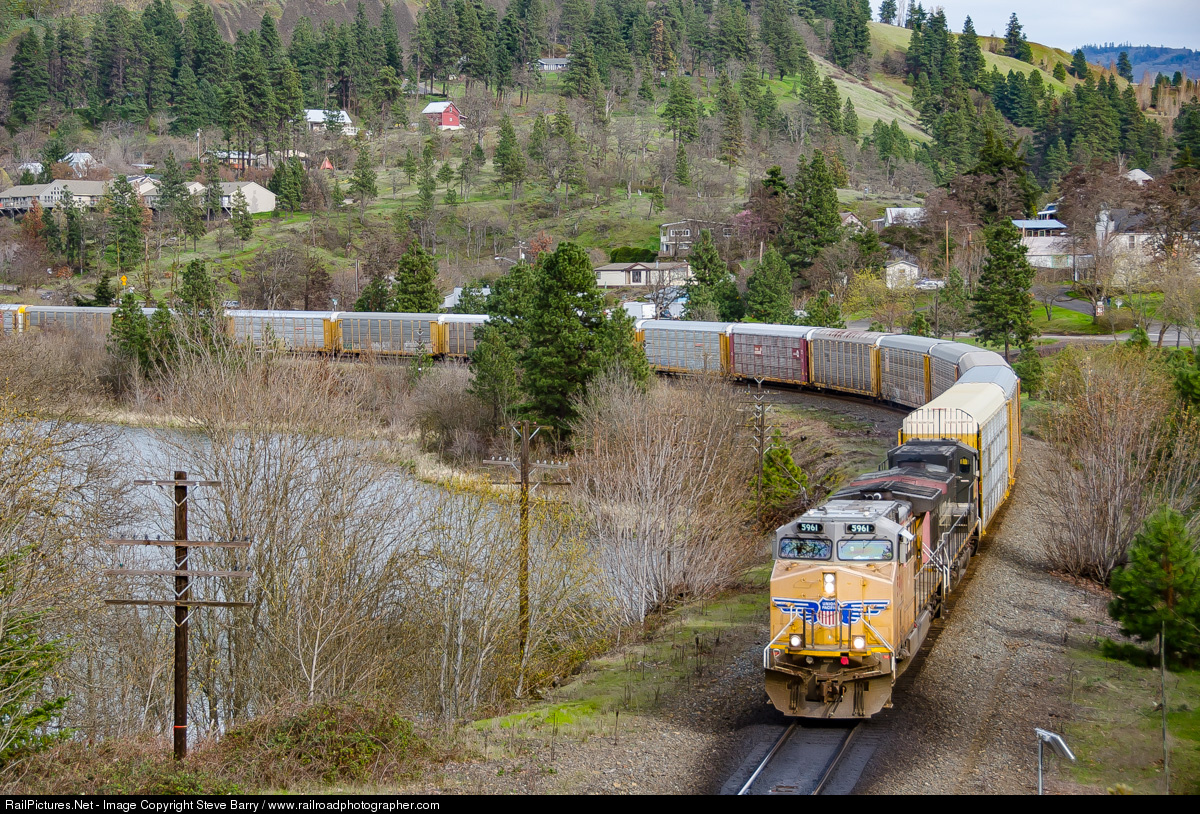 | A westbound auto rack train rolls through the town of Mosier, Ore., in the Columbia River Gorge. |