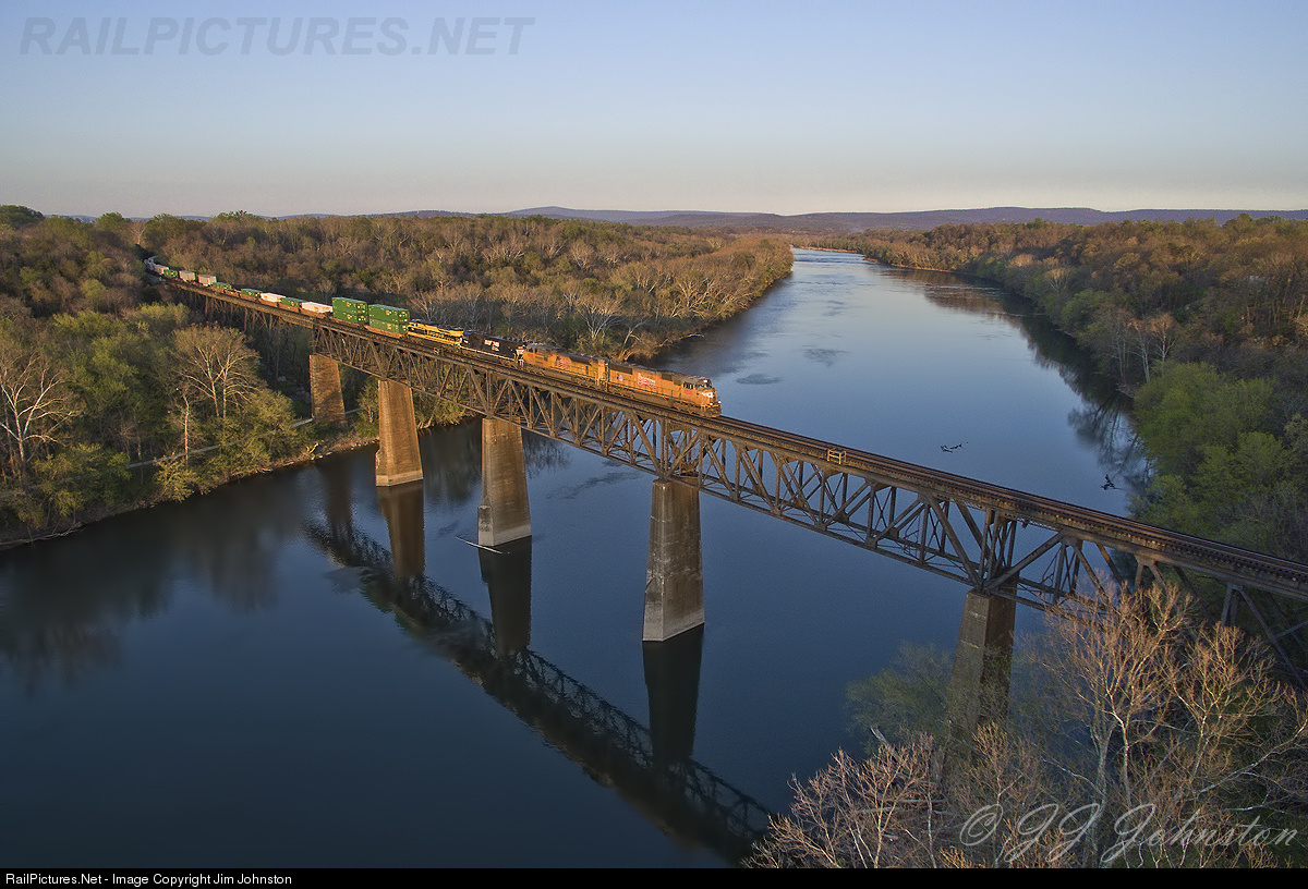 NS 211 Croxton, NJ to Atlanta, GA intermodal crosses the Potomac River from Maryland into West Virginia. Leading the train is UP 4526, UP 8820, NS 7000 and the NS 1069 (Virginian) for power.