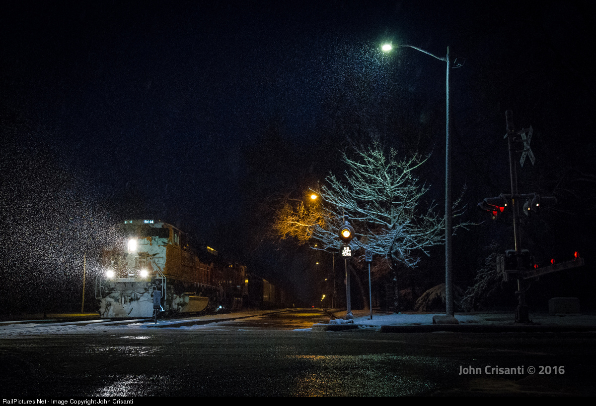 | A cold and snowy early Sunday morning brings peace and silence in the old neighborhood along Atwood Street in Longmont, Colorado. However, that is interrupted by an empty coal train led by BNSF SD70ACe No. 8444 as they make their way through the numerous crossings along Atwood Street on April 17, 2016. |