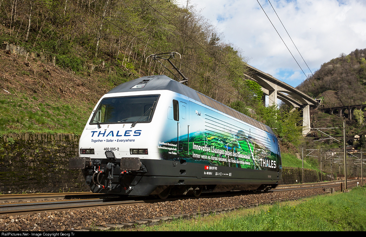 Brand new paint scheme (adhesives) for Re 460 # 005, which is on a transfer and photo run from Bellinzona to Zürich, in the Biaschina on the Gotthard south ramp between Giornico and Lavorgo. The locomotive is now vehicle for advertising for the Thales company, which built the rail signal box technology in the Gotthard Base Tunnel.