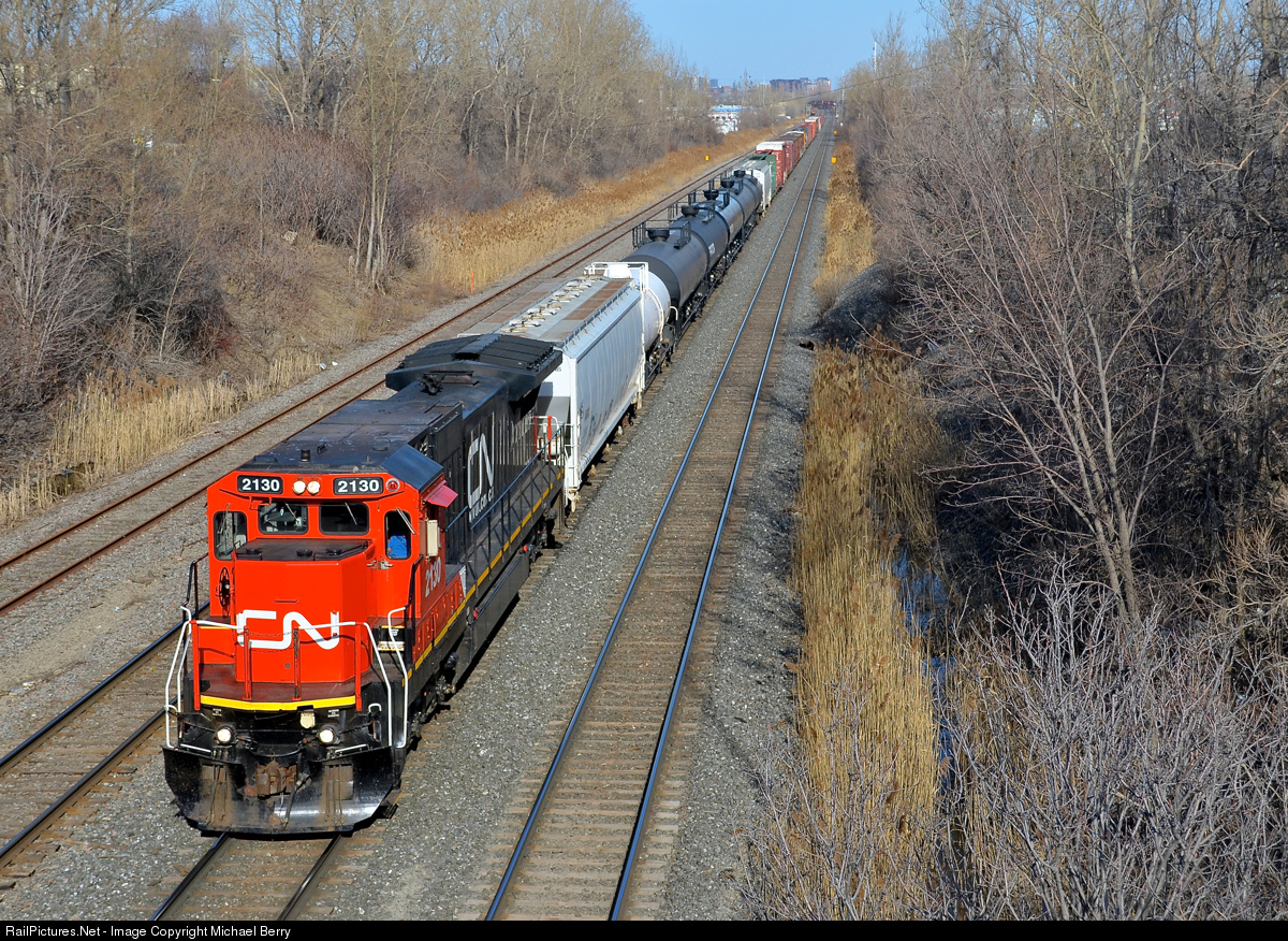 | A one unit wonder back from Vermont. Very clean standard cab CN 2130 is the sole power on CN 323, nearly finished its trip back from St. Albans, VT as it approaches Taschereau yard. |