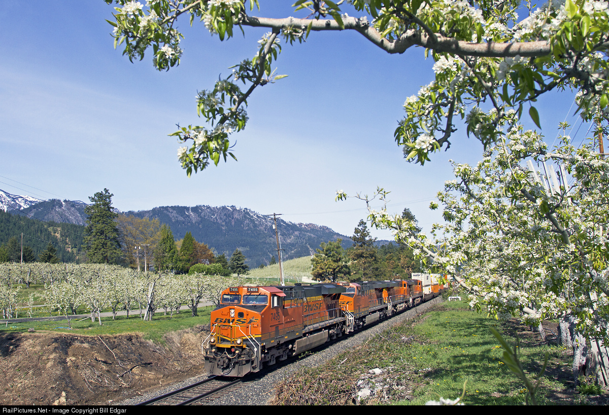 | A BNSF Z train rolls east through apple orchards above Peshastin, WA. Apple blossoms in this location were near their peak on this day. The train is en route from South Seattle to Wenatchee, then on to Chicago. |