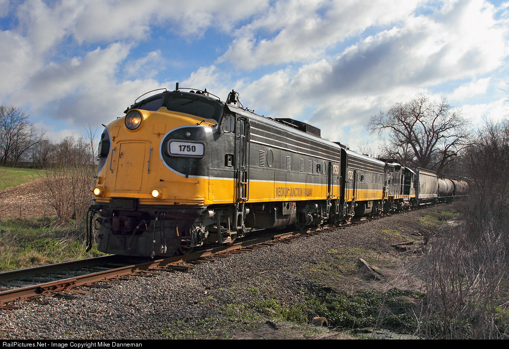 A westbound Keokuk Junction Railway freight is about to cross S. Trivoli Road grade crossing west of Glasford, Illinois, on April 7, 2016. EMD FP9s Nos. 1750 and 1752 and GP20 No. 2003 power the train that originated at Kolbe near Mapleton on this former TP&W line.