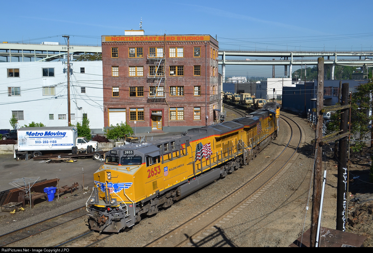 | After many trips between Oregon and California, UP 2653 starts to show some weathering after being on the road since the end of 2015. The locomotive leads a military train south on the Brooklyn Sub. |