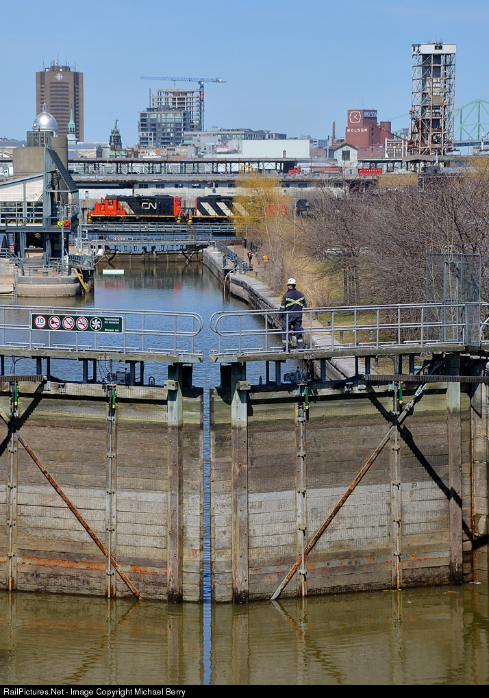 Over the end of the Lachine canal. The Pointe St-Charles switcher is heading towards interchange with the Port of Montreal with a single tank car in tow. GP9's CN 7272 & CN 4141 lead this short train over the eastern end of the Lachine canal. In the foreground is one of the canal's locks.