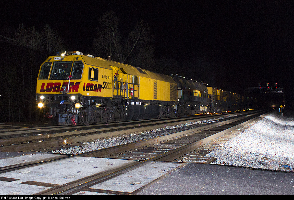 With cutter wheels grinding away at the head of the rails on #1 track, the Loram Railgrinder works it's way west towards Russell for a night run down the Cincinnati & Northern Subdivisions. In a few short moments, the grinding heads will shut off, one by one, as the grinder passes over the Armco Road crossing, which will be taken care of by the Loram "baby-grinder" seen off in the distance under the recently replaced signal bridge at NC Cabin.