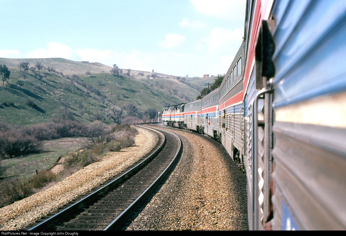 The 1979 Pacific Railroad Society "Mountain Outin" passenger special, with Amtrak SDP40F AMTK 518 and AMTK 517, is rolling westbound towards Bakersfield through Cable. I am taking this photo from the open baggage compartment door next to the vestibule. I was surprised the conductor never told us to close the baggage doors, and I never complained about it. A great way to view Tehachapi Pass freight train action and the scenery.